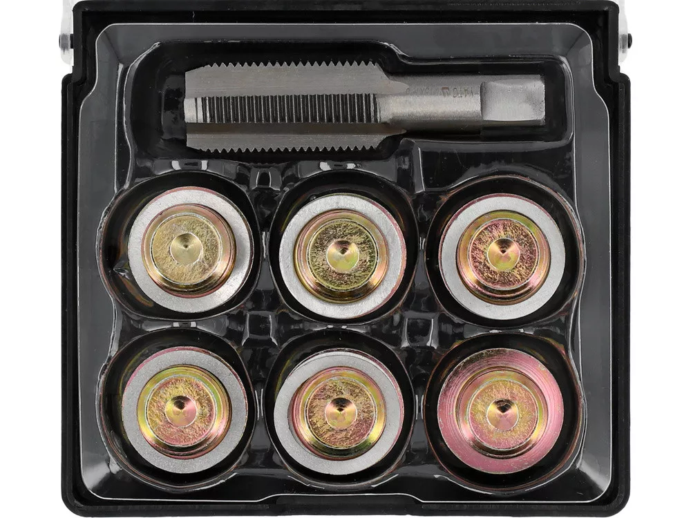 Olajleeresztő csavar menetjavító készlet 7 részes, legtöbb személygépkocsiban és kisteherautóban használt menethez illeszkedik.