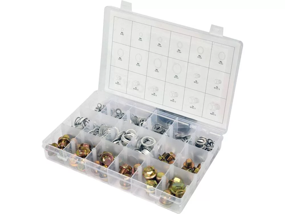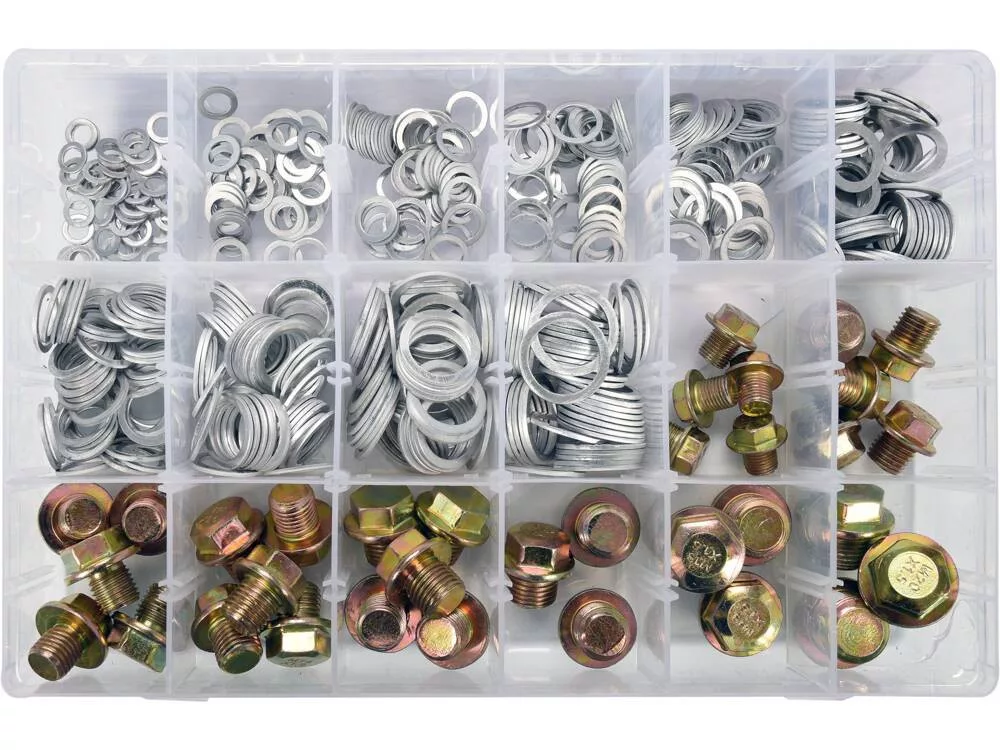 Olajteknő csavar és alátét készlet 534 részes, praktikus tárolóban.