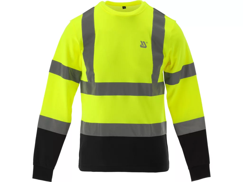Oriolus hosszú ujjú jólláthatósági póló, 50% pamut/50% poliészter, 160 g/m², fluoreszkáló sárga-fekete. Láthatósági osztály 2, nadrággal kombinálva osztály 3, tartós, komfortos és hővédelmet nyújtó munkaruha.