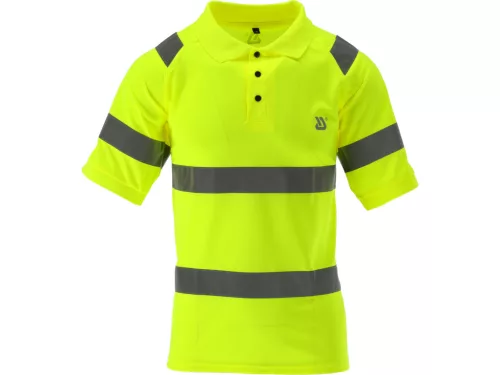 Oriolus jólláthatósági galléros póló (polo), 100% poliészter, 140 g/m², fluoreszkáló sárga. Láthatósági osztály 2, nadrággal kombinálva osztály 3, 360°-os fényvisszaverő csíkokkal, légáteresztő és tartós munkaruha.