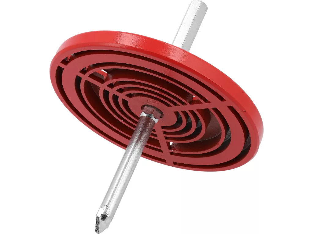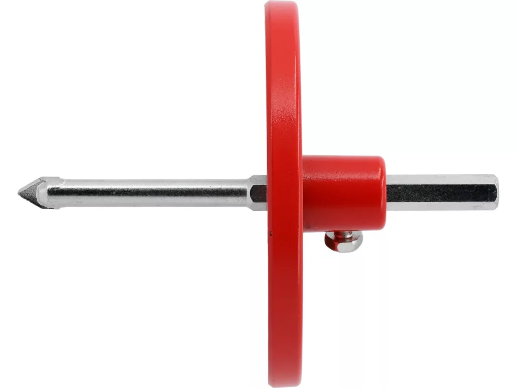 Központfúróval szerelt rögzítő tányér wolfram-karbid furókhoz, precíz és biztonságos fúrást biztosít ásványi anyagokon; alkalmazás: kerámia, szilikát, cellás beton, tégla.