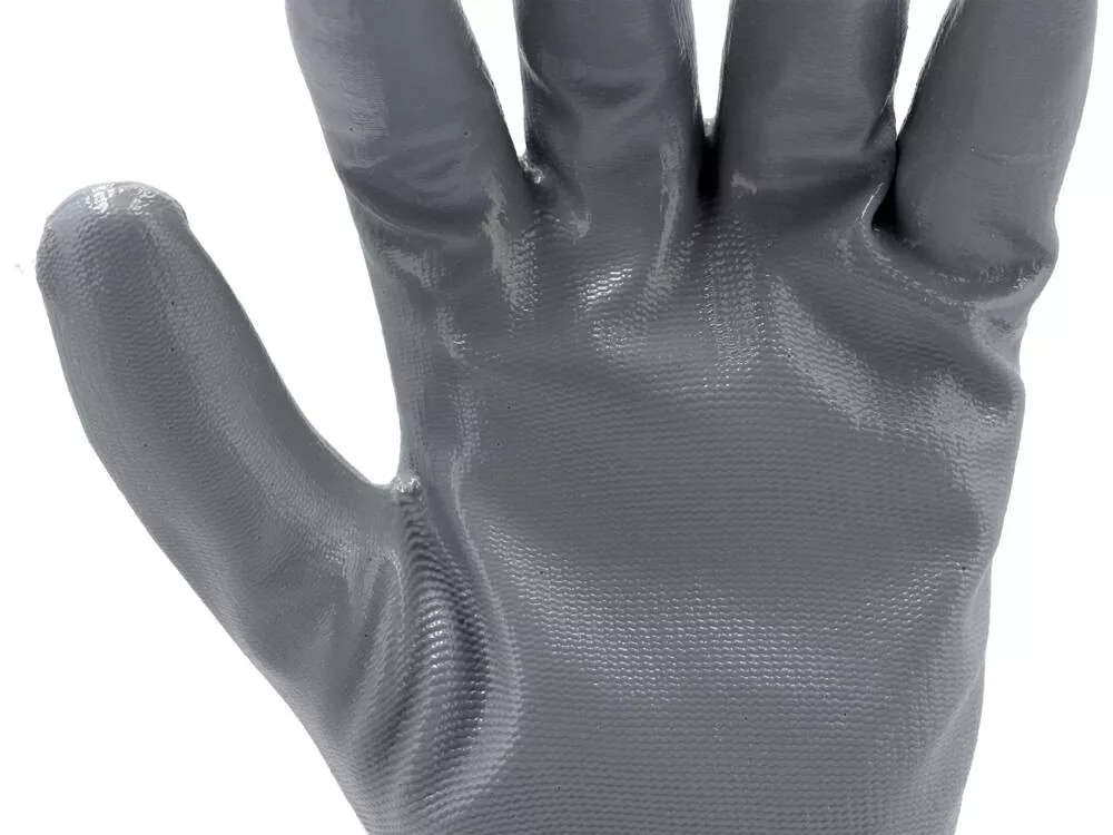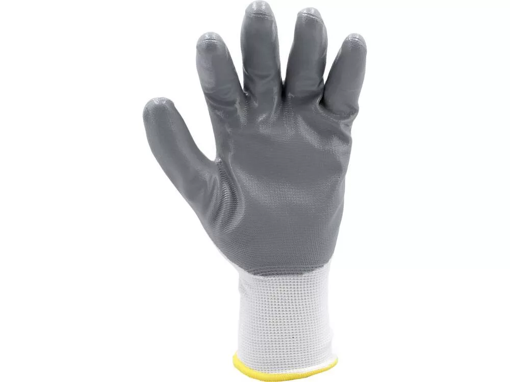 Szerelő kesztyű fehér nylonból, szürke nitrillel bevonva a tenyerén.