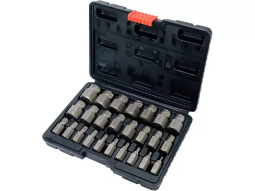 Törtcsavar kiszedő készlet 25 részes (belső torx, imbusz és spline csavarokhoz), professzionális gépészeti és autóipari munkához.