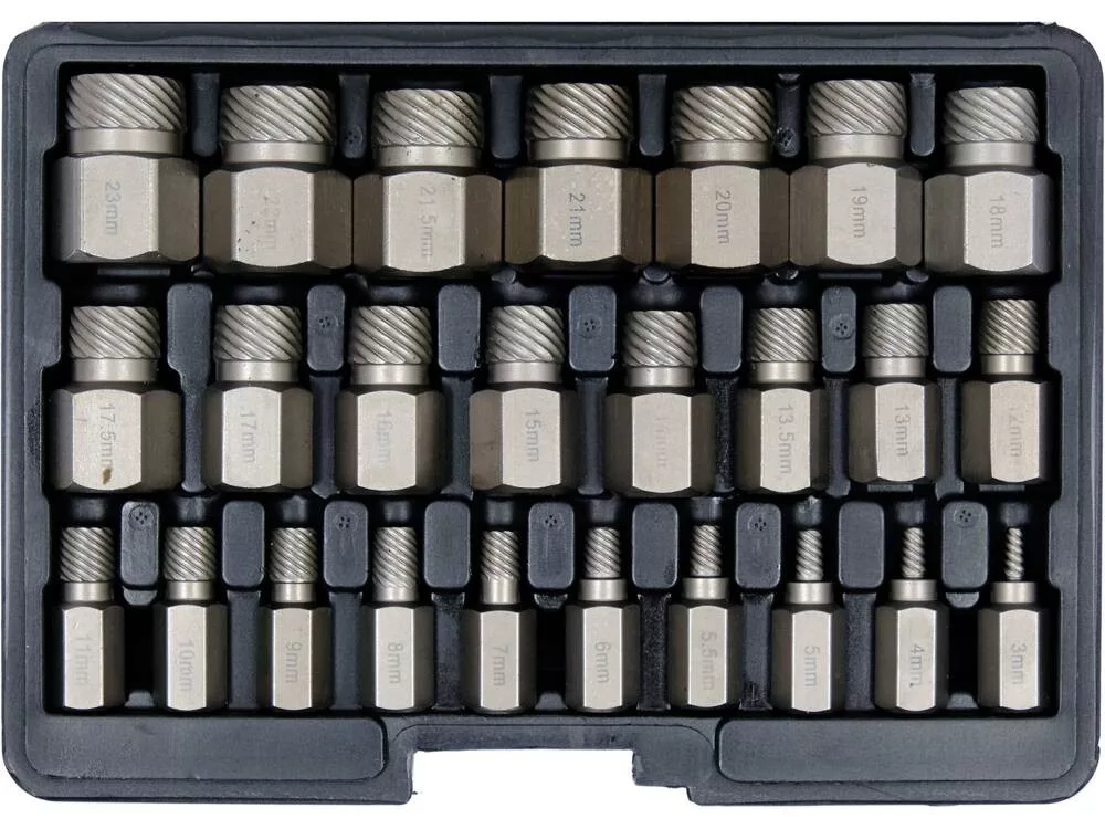 A teljes készlet 25 elem tartalmaz, 3 mm és 23 mm közötti munkatartományban.