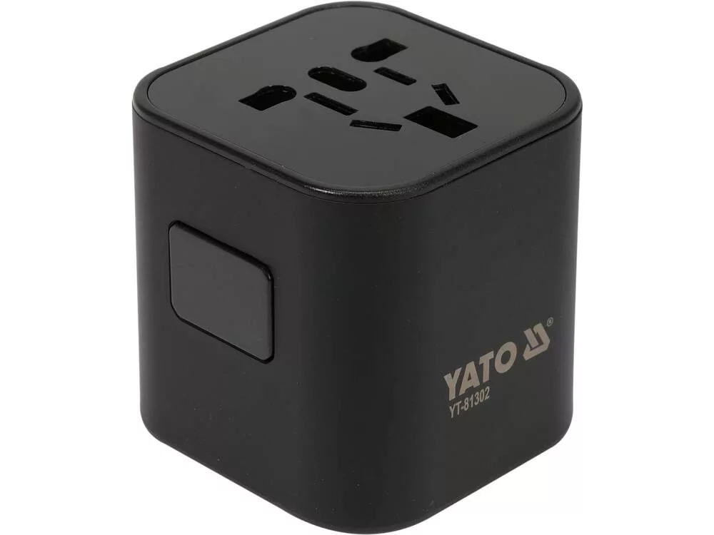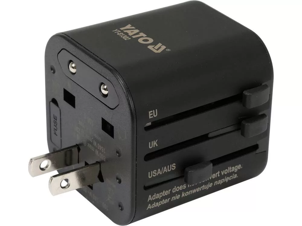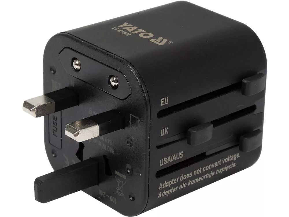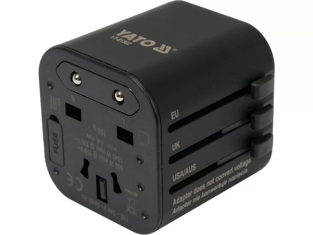 Több mint 150 országban használható adapter. Kihúzható dugókkal rendelkezik, amelyek reteszelő mechanizmusa megakadályozza, hogy a csapok visszacsússzanak a házba. Az adaptert könnyen hozzáférhető kerámia biztosíték védi a rövidzárlat ellen. Tartós, égésgátló műanyagból készült ház.