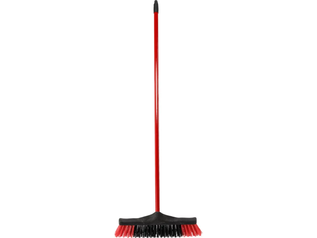 Erős utcai söprű, PP fejű, külső körülményeknek ellenálló vastag sörtékkel; nyele acéllemezre vont műanyag borítást kap, kültéri takarítás levelekhez, homokhoz és hóhoz.