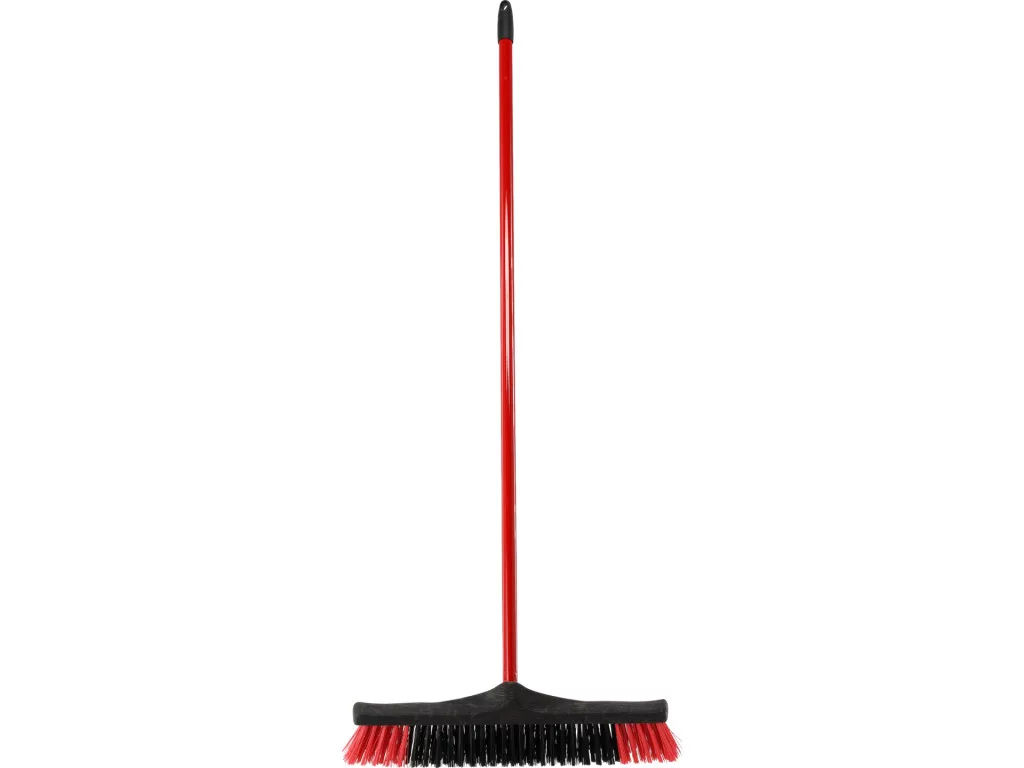 Masszív utcai seprű, külső környezetnek ellenálló PP tokozással, vastag PET/PVC sörtékkel; nyél acéllemez, műanyag bevonattal, domináns piros színű, fekete-piros sörtékkel.