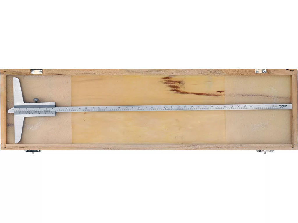 Mélységmérő tolómérő precíz mérőeszköz furatok, hornyok és mélyedések mélységének meghatározására, tartomány 0–150 mm-től 0–400 mm-ig, pontosság ±0,03 mm, felbontás 0,01 mm, szénacélból, 5–40 °C, praktikus csomagolásban.
