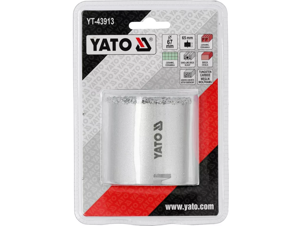 Átmérő 67 mm, vágási mélység 65 mm, anyag YG8 + A3, munkafelület wolfram-karbid bevonatú, alkalmazás: habbeton, tégla, szilikát, kerámia